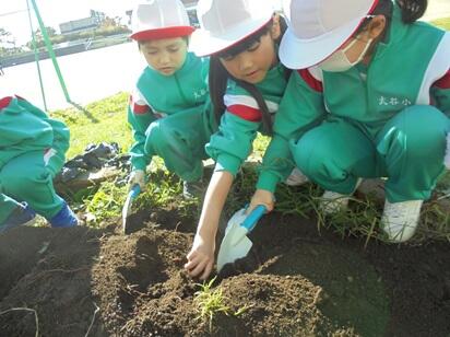 チューリップの球根は開花のために、寒い冬の時期を土の中でおよそ2か月間過ごす必要があるそうです。校庭で遊んだり運動したりする子供たちの元気のよい声を浴び、きっと春には美しい花を咲かせてくれるのではないかと思います。