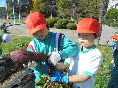 その頃1年生は自分たちで植えたさつまいもの収穫に一生懸命に。「先生見て!つるが私の身長よりも長く伸びてるの!」「このいも、スーパーで売っているのより大きいよ!」「なんか…すごくごつごつしてるなあ…」と、どの子も夢中になって土を掘り、まるで宝探しをしているかのようでした☆