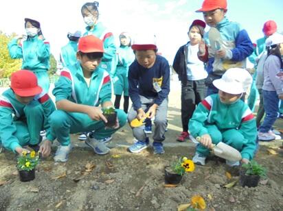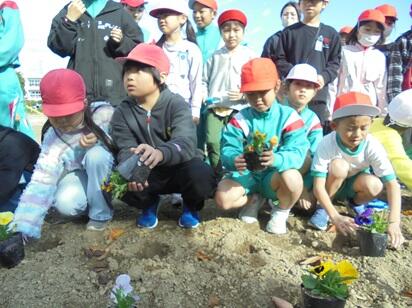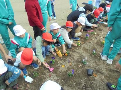 チューリップの球根、ビオラとパンジーの花苗を植えました。これから季節は厳しい冬に向かうところですが、校庭の花壇が明るさを取り戻しました。