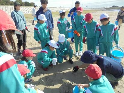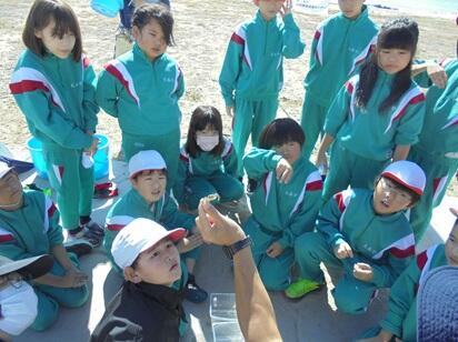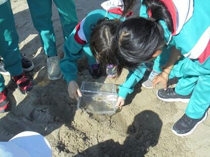 4年生が大谷海岸でスナガニの生態調査を行いました。生態調査には、南三陸町自然環境活用センター(南三陸ネイチャーセンター)から阿部拓三博士に同行していただきました。