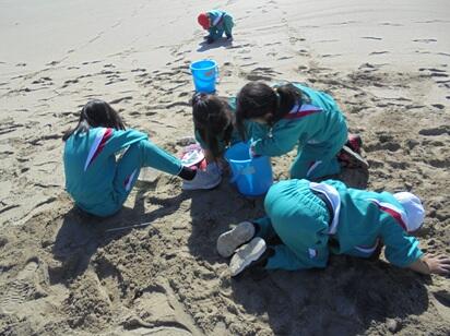 発見したスナガニは全て甲羅の横幅を測定し、1匹ずつ記録を残します。子供たちは拓三博士に教えてもらった雌雄の判別方法や利き手の見分け方を用いて瞬時に判断し、観察の結果を記録することができました。その後スナガニは1匹ずつ丁寧に砂浜へ。水槽から出ると素早く砂浜を歩き回り、自分のお気に入りの場所ですぐに巣穴を掘り始めるスナガニの姿に、再び大きな歓声が上がりました。