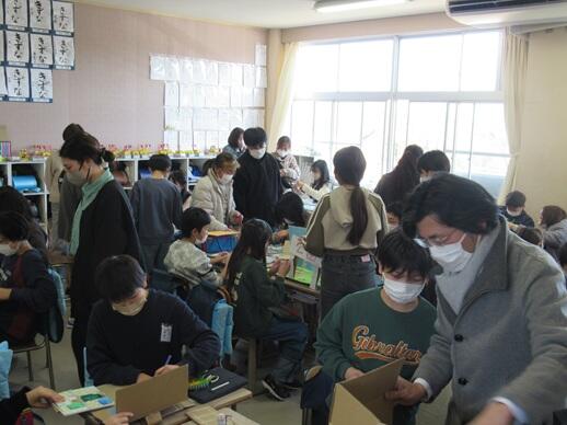 5年生がものづくり教室に取り組みました。ものづくり体験と社会人との対話を通して、アイディアを生かす体験と地域で働く楽しさを感じさせることをねらいとした取組です。宮城県のキャリア教育支援の委託事業で株式会社マナライブ様、みらい造船様の支援を受けて実施しました。コンピューターアプリの教育版「マインクラフト」を使ってメロディボックスの蓋に船の形をデザインする活動と、ケースに穴開けをしたり、電池の配線をしたりして電池ボックスを作る活動の二つを行いました。子どもたちは、「普段できない体験ができた」「プログラミングの工夫ができて達成感があった」との感想が聞かれ、有意義な時間となりました。