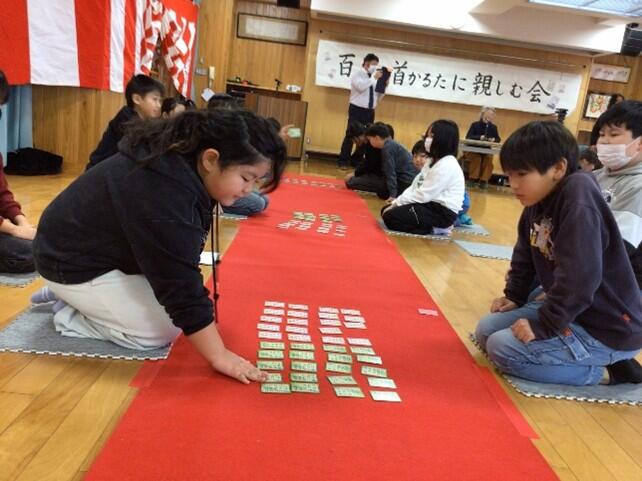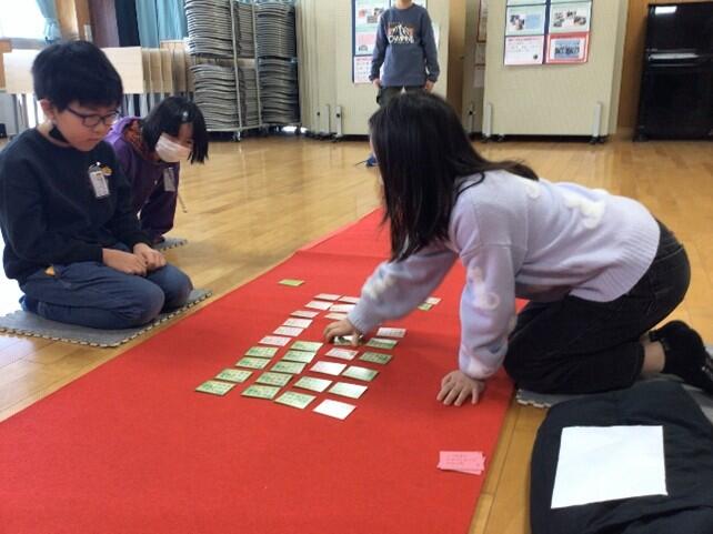 本日、3・4年生が国語の時間に、百人一首かるたに親しむ会を行いました。
