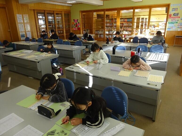 各教室を見ると、水を打ったような静かな雰囲気の中、子供たちが一生懸命に筆を進める音だけが響いていました。心を落ち着けて作品と向き合うとてもよい時間を過ごすことができたようです。