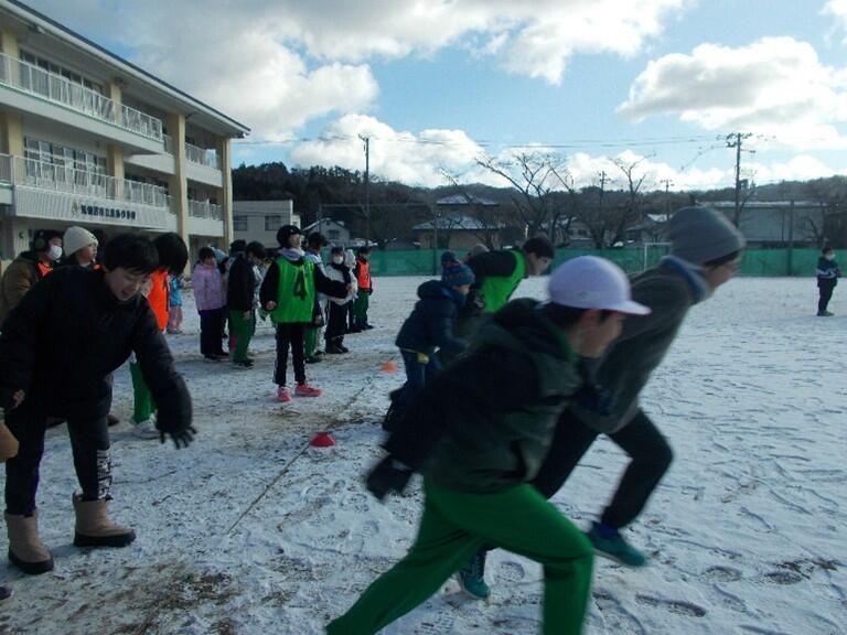 本日、校庭に積雪があったため、全校で雪上かるた大会を行いました。