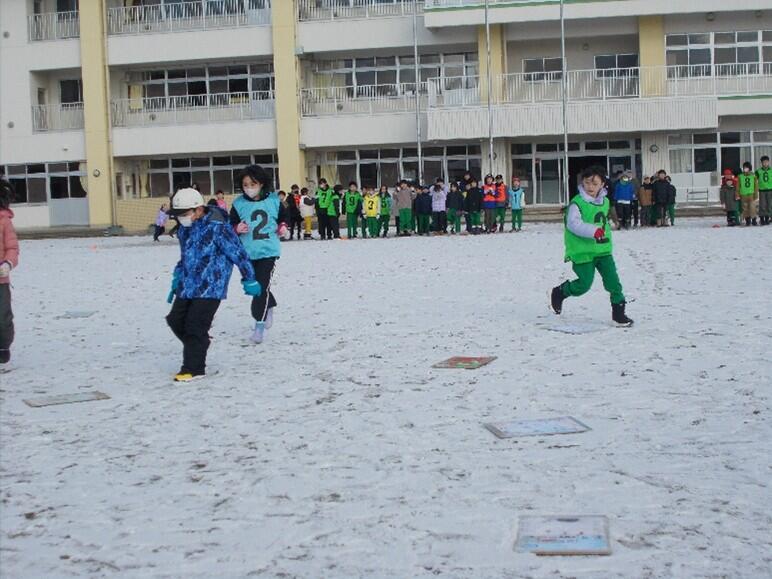 かるたの読み札を読み上げると、取り手の児童は勢いよくかるたに向かって走り出しました。低学年は高学年とペアとなり、高学年が手を引きながら一生懸命かるたを探しました。勢い余って雪にまみれる児童もいました。かるた取りを通して、学年間の交流も深めることができました。