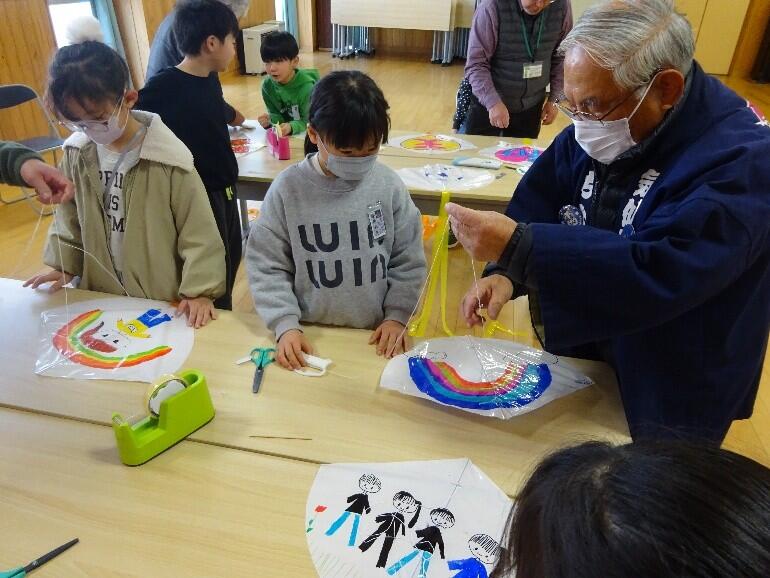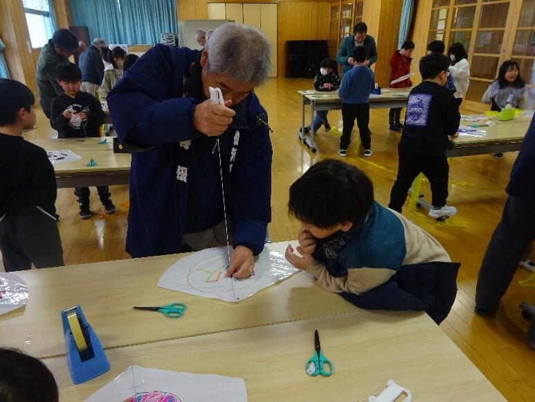 気仙沼凧の会の皆さんにお出でいただき、子供たちに凧の作り方を教えていただきました。子供たちが事前に絵を描いたシートに、竹の骨組みや糸、しっぽを取り付けたりして凧を完成させました。子供たちのアイディアで、色とりどりの凧ができました。完成した凧を早速校庭で揚げると、なかなか高くは揚がりませんでしたが、凧の会の方々のアドバイスを受けると、校舎よりも高く揚げることができている人もいました。凧の会の皆さんのおかげで、冬の遊びの代表である凧揚げに親しむことができました。