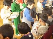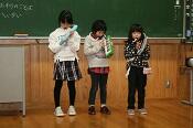 今年度,最高学年として鹿折小学校をリードしてきた6年生の教室をのぞいてみたら,『英語劇:ももたろう』の練習をしていました。小学校でも,新しい学習指導要領では,ひとつの教科として扱われるようになります。これまでの『外国語活動』の集大成として,『英語劇』に挑戦しています。話の筋は誰もが知っているお話しですから,日本語のセリフもみな頭に入っています。それを英語に置き換えて,身振り手振りを交えながら,劇に仕上げていきます。英語がずいぶん子供たちの身近になってきたことを痛感します。
