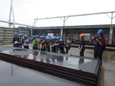 みらい造船は、震災後5社の造船所が協力して設立し、100年先の未来まで造船を続けていけるようにという願いが込められた会社です。みらい造船では、船が鉄板から形作られその数が800枚以上にもなることに驚いていました。また、造船中の船を見て、その大きさにも驚かされていました。また、子供たちが疑問に思ったことについてもお答えいただきました。