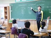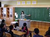 それとは対照的に,一年生は大盛り上がり。初めてのALTのベル先生との『英語学習』です。出身国のことを大型TVを使い,問答しながら授業が進められました。画面に映し出されたオーストラリアの動植物・名所・名産などを紹介し,それらを『英語発音』で『日本語発音』とのちがいについて,ベル先生の発音を真似ながら勉強しました。