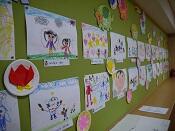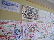 3年生教室の壁面には,水彩絵の具の特徴を理解し,描画に生かそうと,点と線の練習作品が掲示されてありました。水彩絵の具は,水加減で色々な雰囲気を出すことができます。『にじみ』や『ぼかし』の効果です。色を重ねるとまた違った感じも出ます。なかなか面白い学習です。