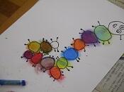 教室では,2年生が何やら楽しい図工の授業をしていました。クレヨンで着色した後に,ティッシュでこすって色をぼかしています。描いた虫のからだが虹のように輝いて見えました。どの子もかわいらしい虫を描いていました。