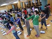 ダンスの得意な5・6年生は,軽快な『嵐(あらし)』の音楽に乗って,全身をフルに使ってダンスの練習です。式台の上には,小野寺先生がダンシング・ヒロインよろしくお手本の踊りを披露。児童も負けじと,うでを伸ばし,足を上げ,膝をつき,ジャンプをして・・・・・,ダンス練習をしました。それを見ていた1年生教室からは,かわいらしい「○○ 先生がんばって~!5年生頑張って~!6年生頑張って~!」の拍手と声援が・・・・・。