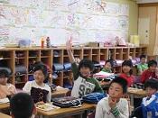 4年生と5年生の教室では,「デジタル教科書」を黒板に投影し,先生が問題を出したり,解答を説明したり,スクリーンにマジックで自分の考えを書き込んだり・・・・,最先端のICTを活用して,算数の授業を進めています。「デジタル教科書」を使うことによって,児童は,まるで黒板が自分の机の上と同じような感覚で,見比べながら学習していました。(学校教育のIT化が本格化しています。「時代は,確実に進んでいるなあ~!」そんな感じです。)