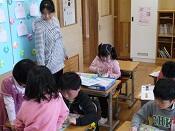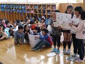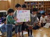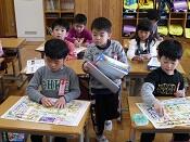 まず,2年生が『ミニ先生』になって,先日作っていた『絵カード(紙芝居風)』を見せながら,1年生に校内のいろいろな教室や施設を紹介しました。説明のなんとていねいで,かわいいこと・・・・。大人にはない着眼点をもって,紹介していました。