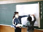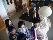 その後は,2年生が1年生の手をとって,行ってみたい場所に案内していきます。1年生にとっては,音楽室,上下に動く大きな黒板,家庭科室の調理台,理科室の水道付きの机や様々な実験器具・・・・。見る物すべてが,発見と驚きの連続です。私は,骨格標本を教室内に出して,待っていました。「こわ~い!」と言って近づかない子,おそるおそる触ってみる子・・・・。「こわくないよ。大丈夫だから・・・ネ。」と,お兄さんぶり・お姉さんぶりを発揮する2年生でした。