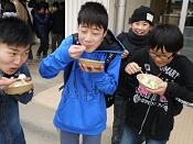 支援でアイスクリーム製造マシーンも持参してくださいました。アイスクリームの上に,狭山のお茶をふりかけ,『抹茶アイス』でごちそうになりました。(とても肌寒~い日でしたが,みんな美味しくいただきました。)
