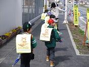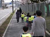 震災復興工事が進む中,私たちの鹿折小学校は,『復興工事の現場の中の学校』といえます。大型トラックが砂利や土を積んでひっきりなしに道路を行き交っています。伴って,通学路もこれまでに何度もコースが変更になりました。そんな学区を通学するお子さんたちに身につけてほしいのは,『絶対に事故に遭わない!』との強い気持ちと交通ルールです。