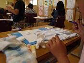 白い紙粘土に,絵の具を混ぜ込んで『カラー粘土』にし,それを思い思いにお店の商品に仕上げていく学習です。ペンダントあり,キーホルダーあり,小物入れなどもありました。これらが店頭に並んだら,さぞかし華やかなお店が開店することでしょう。今から完成と店開きが楽しみです。