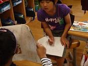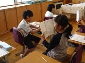 まず,2年生が『ミニ先生』になって,先日作っていた『絵カード(紙芝居風)』を見せながら,1年生に校内のいろいろな教室や施設を紹介しました。説明のなんとていねいで,かわいいこと・・・・。大人にはない着眼点をもって,紹介していました。