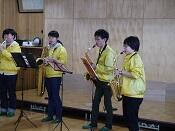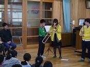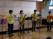 今日は,札幌の大学生の方々も一緒に来校され,吹奏楽のアンサンブル・ミニコンサートも開いて下さいました。トロンボーン,ホルン,バリトンサックス,テナーサックス,アルトサックスの5種類の楽器が奏でる演奏にしばしウットリ・・・・。楽器の説明もしていただきましたし,楽器にも触らせていただきました。