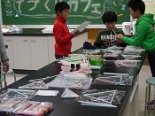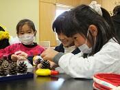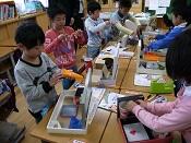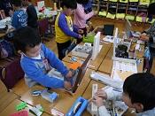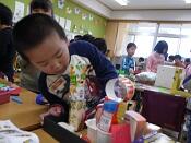 1年生は,先日の2年生の『おもちゃ祭り』に刺激されてか,はたまた今週末の『若草祭り』に向けてか,『おもちゃをつくろう!』(生活科)の学習をしていました。『秋さがし』の学習で見つけたマツボックリやドングリの実を『投げる玉』にして思い思いにゲームづくりに夢中です。誘われて私もゲームに参加しました。なかなか手が込んでいて,思うように得点が入りません。1年生なりに難易度に段階をつけて,的をつくっていました。互いにゲームを楽しむ中で,互いの工夫点や良さをいっぱい発見していたようです。夢中になるって,いいですね。ハサミやセロハンテープの使い方や色紙の使い方も上手になってきました。