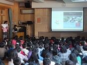 先日の『第8回ESDサイエンス・カフェin気仙沼』での研究発表を,朝会の時間を利用して,当日参加しなかった全校に向けて発表してもらいました。同じ学校のお友だちが,こんなにもすばらしい着眼と地道な調査や制作をし,研究としてまとめた成果を聞き,みんな驚いていました。あらためて普段の生活の中から『疑問の目』をもつことの大切さ,それを解明・解決するために『筋道立てて考え,実践すること』の大切さを2人のお友だちから学ぶことができました。