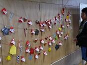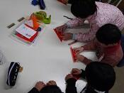 委員会のリーダーが,折り紙の折り方を細かに説明し,その説明に応じながら『サンタクロース』の顔を折りました。思い思いにサンタの顔をペンで仕上げて,ひもにつるしました。短時間の活動でしたが,全部をつなげてみると壮観です。