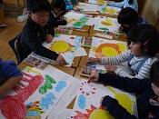 1年生は,図工で地元大島の詩人,水上不二の詩を題材に『感想画』を描いていました。『みどりの真珠』と『ライオン』という詩から得た感想を思い思いに描いていました。色鮮やかなたてがみのライオンとみどりの真珠に海の生き物が集まって眺めている様子を上手に描いていました。