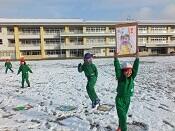 今朝は,今季一番の寒さでした。雪もちらつき,校庭は一面の雪。この機を逃してはと,1年生は業前の時間に校庭に飛び出し,一足早い『雪上カルタ取り』(プレ大会)で,雪を満喫しました。白山小学校の伝統的な学校行事でもある『雪上カルタ取り大会』は,統合した鹿折小学校でも昨年度実施しました。何せ,お天気のことですから,いつ手頃な雪が降ってくれるか分かりません。めざとくそれを感じ取った1年生が,小規模ながら,今朝楽しく遊んでいました。読み札を聞き終わると同時に,雪上をかけだし,あっちにこっちにと取り札を探し回ります。目指す札をとった時の喜びよう,応援のお友だちからも,ドーッと歓声が沸き上がりました。