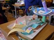 子供たちはいろいろなコースを構想しています。山あり谷ありの起伏に富んだコース,一本橋のように細くなったコース,高い塔からジェットコースターのように速いスピードで転げ落ちるコース・・・・,どれを見てもアイディアに富んでいます。