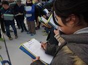 書きぞめの歴史を振り返ってみると,1月2日の『仕事始め』に合わせ,今年一年がよい年になるよう願いを込めて,また,学童は,文字がきれいに書けるようになることを願って,一年の抱負や意気込みを書いて,神様に納めるのが本来の習わしのようです。そのことを開会に当たり全校に話し,大会をスタートさせました。先週の金曜日の最終練習にも増して,今日の各教室や会場の緊張感は,他を寄せ付けないほど強いものがありました。もちろん先生方が声をかけることも禁じられています。
