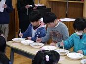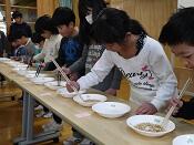 中でも,一番盛り上がったのは,『正しい箸の持ち方をしっかり身に付けよう』と,正しい持ち方を確認した後に行った『大豆のはしつまみ競争』です。学年ごとに使う箸に差をつけ,割り箸(低学年)・塗り箸(中学年)・さえ箸(高学年)で45秒間にどれだけ多くの大豆を別の皿に移動できるか競い合う競技です。お友だちの声援を受け,各学年の代表が取り組みました。入賞したお友だちは,手作りの金メダルと銀メダルをもらい,大喜び。また,学校給食クイズもあり,これもまた盛り上がりました。