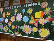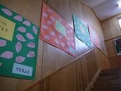1年生は,図工の時間を使って「来賓と保護者控え室に飾る絵」を描いてくれました。色鮮やかな春の草花です。想像の花かもしれません。花のまん中には,笑っている笑顔も描き足してありますし,虹もかかっています。階段には,各学年のお友だちからの『感謝とお祝いのメッセ-ジ』が掲示してありました。