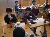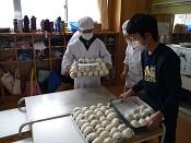 先生方も自宅から炊飯器を持参し,家庭科室・理科室・5/6年教室等に分散してご飯を炊きました。担任の声がけで,卒業生も応援に駆けつけてくれて,5年生と先生方総出で,おにぎりを握りました。具のないごま塩だけの塩むすびで,大小様々,形も様々です。