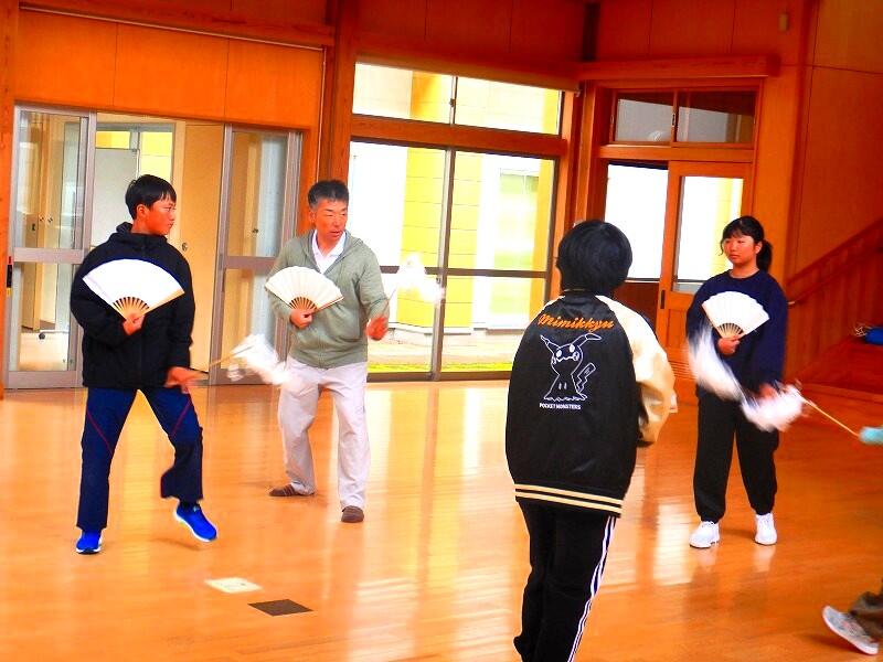 昔の先輩たちのビデオを見せてもらってから、早速踊りの指導に入ります。6年生たちは、昨年の指導を思い出しながら踊っているようです。