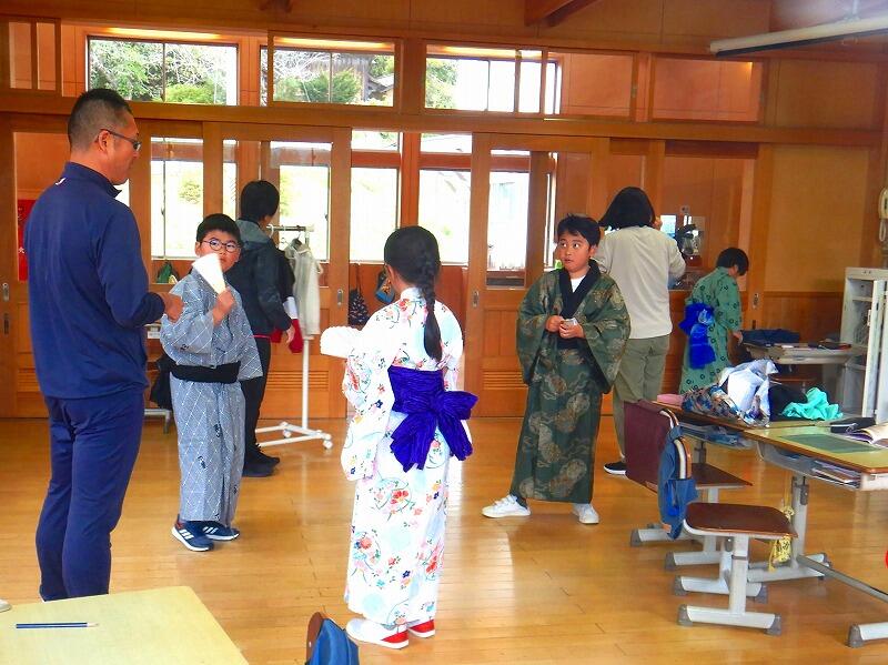 鹿踊保存会の皆様と保護者の皆様に、着付けをしていただきます。