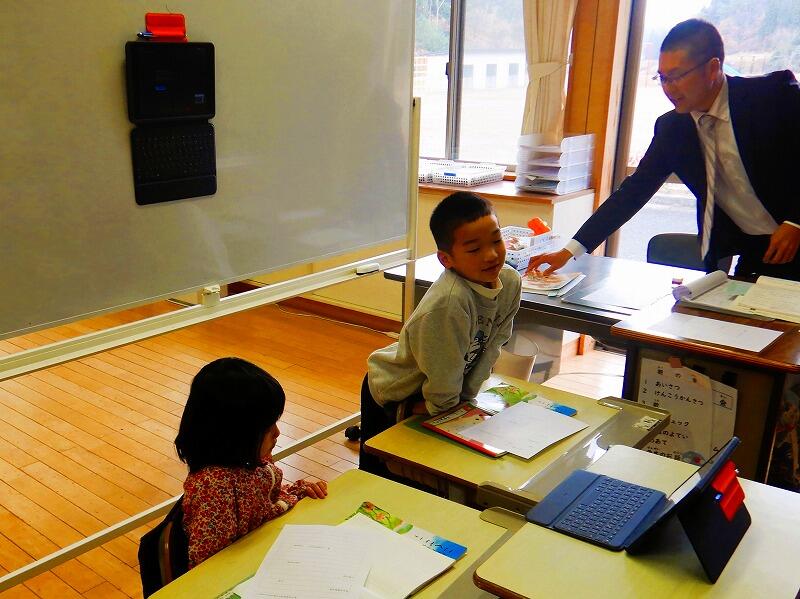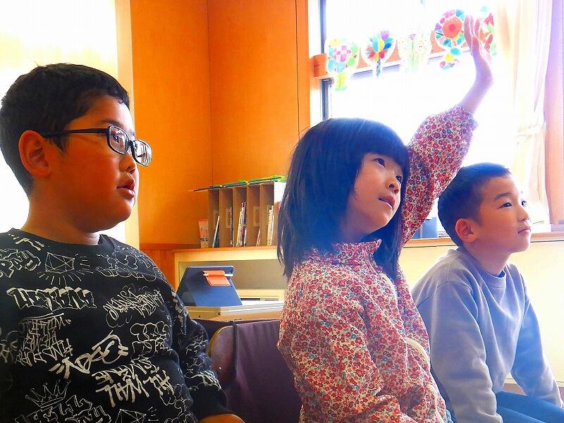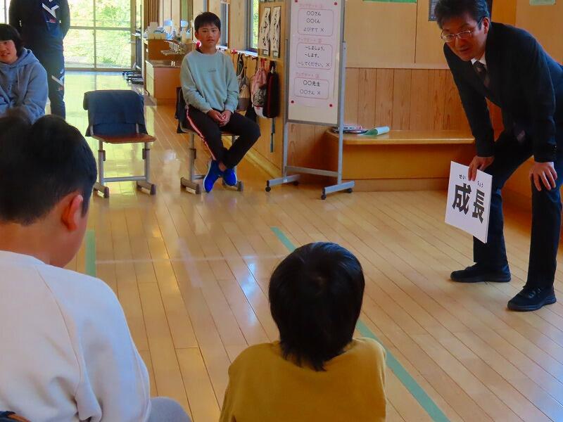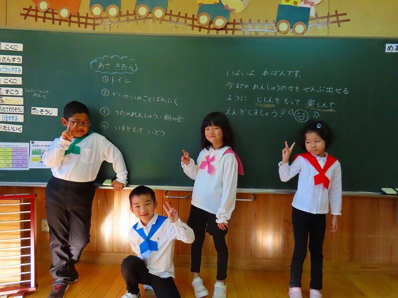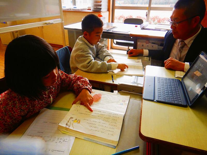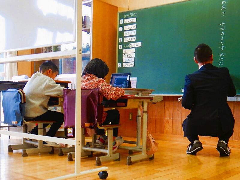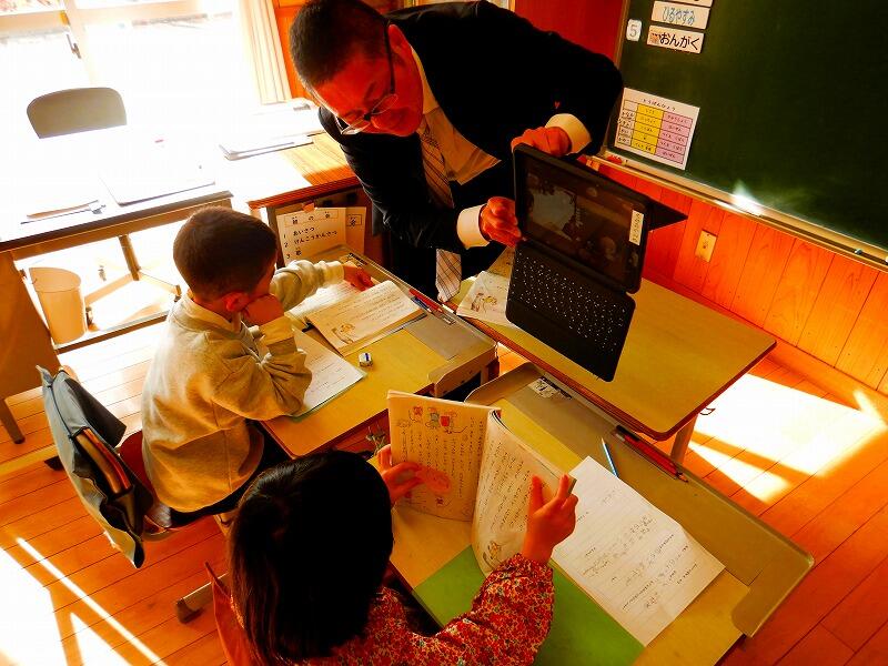複式指導なので担任が常にそばにいませんが、自分たちで「発表します」「聞こえますか」「しつもんします」などと言いながら進めており、短期間でも成長のあとが見られました。