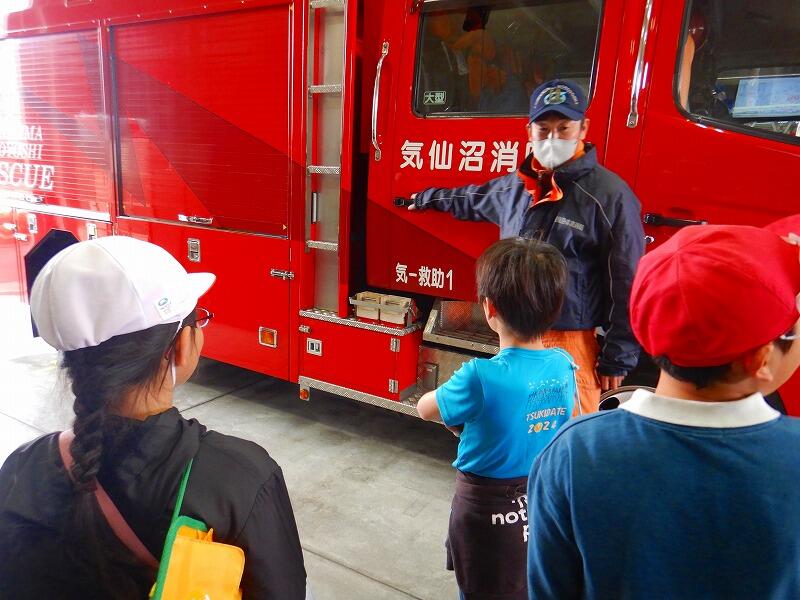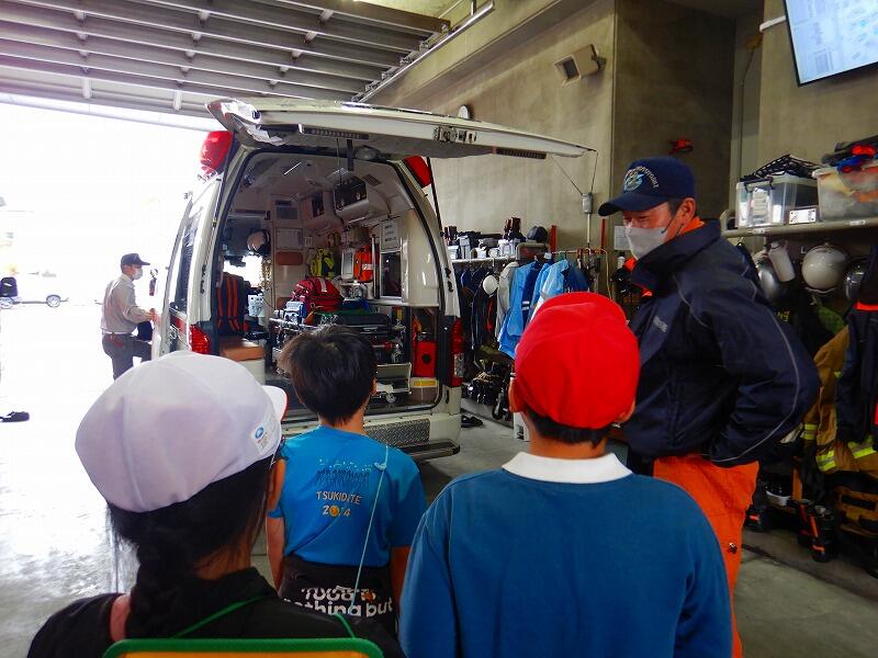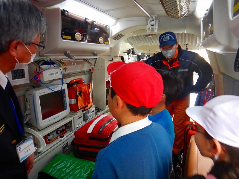 救急車の中も見学し、救命活動に使う道具がたくさんあることを教えてもらいました。