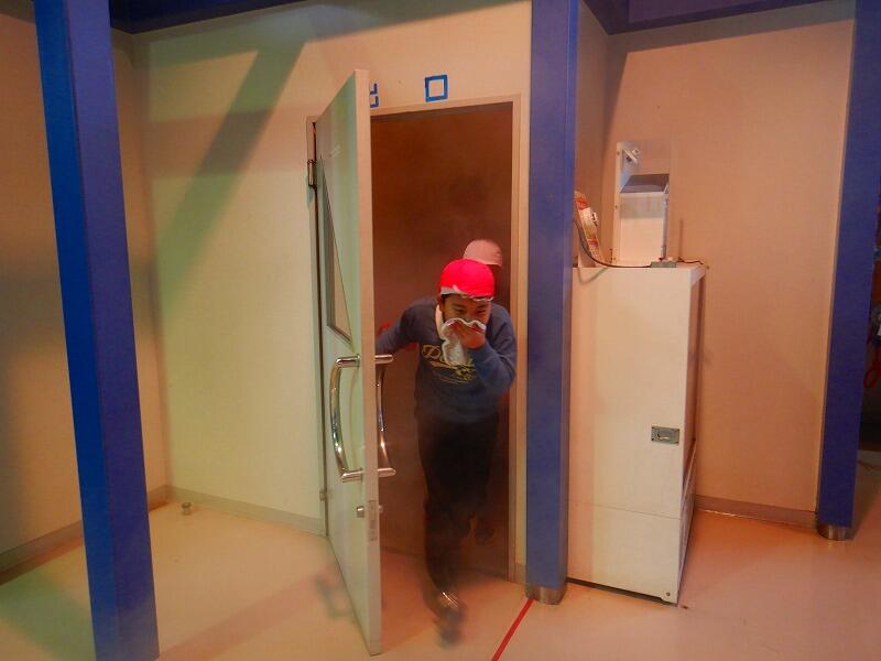 今年2回目の煙体験。煙が充満した室内から避難する体験により,煙の怖さと,火災時の避難方法を学びました。