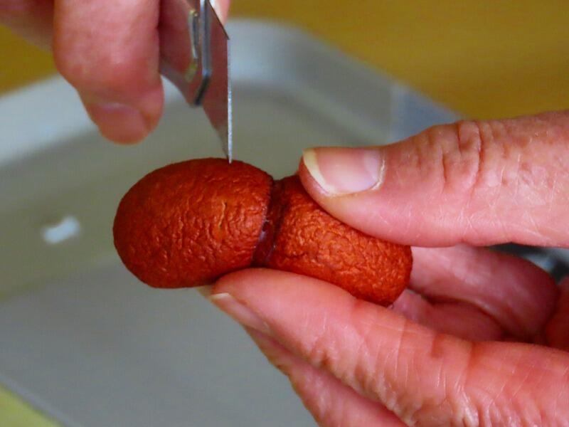 耳の部品となるものを2片、はさみで着色した繭から切り出します。