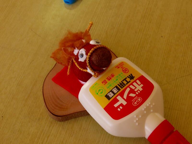 着色していない白い繭の部品を、馬の頭部の先に接着します。