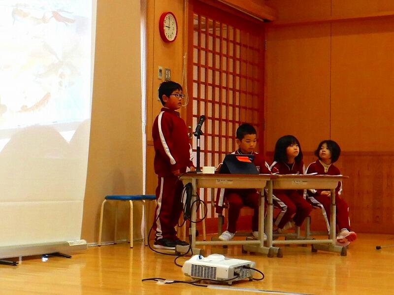 1・2年生。落ち着いてしっかりと自分のせりふを発表できるよう頑張ります。投影する画像も自分たちで差し替えます。