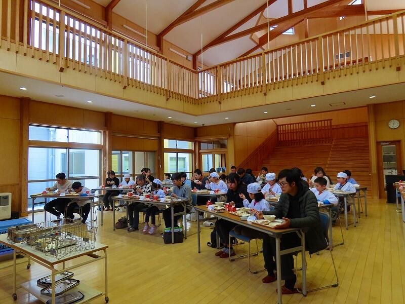 後半は、多目的ホールで給食を配膳し、みんなで給食を食べました。