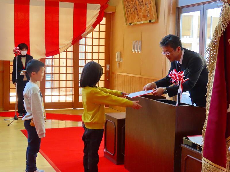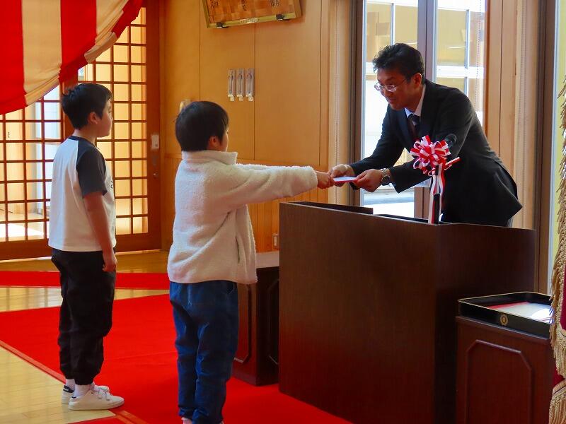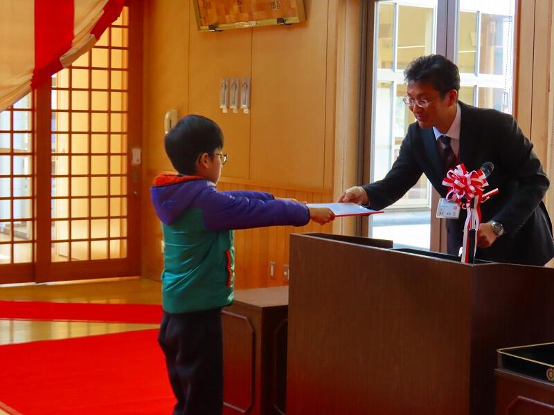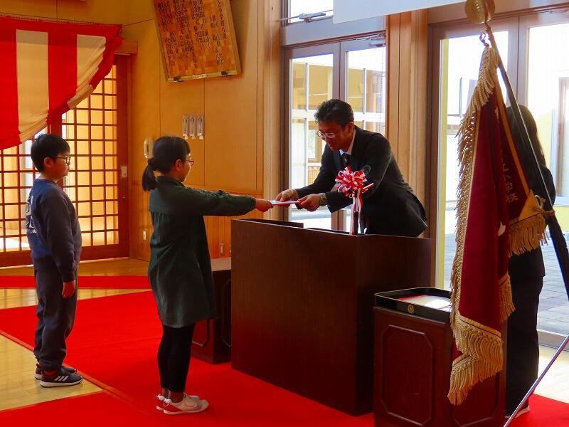 修了証書は1年間みんなが頑張ってきた証であること、通信票に書かれた先生方からのメッセージを読んで次の学年への意欲を高めてほしいこと、そして4月から3月までのみんなの歩みを振り返ると、どの活動も大切な思い出であり、一人ひとりが大きく成長してきたことを話しました。