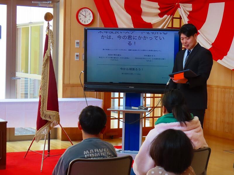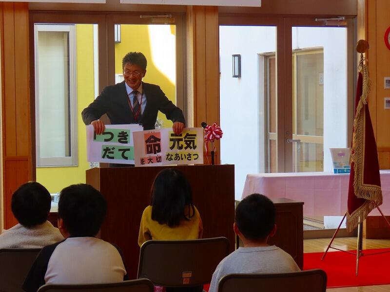 また、1年を通して目指してきた「3つのめあて」、「元気なあいさつ」「命を大切に」「つ・き・だ・ての子」についても、みんながよく頑張ったことを伝えました。