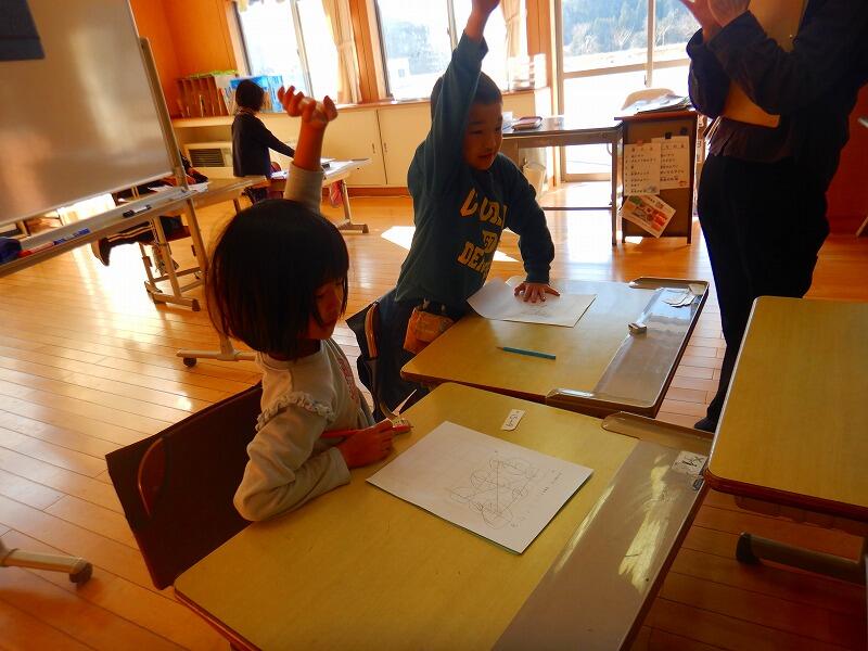 「~ができた人?」という問いかけに、「はーい!」と手を挙げる声が画面の向こうからも聞こえ、寄磯小学校の友達と同じ時間・同じ学習を共有している様子がうかがえました。