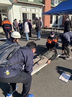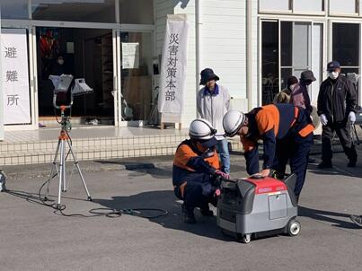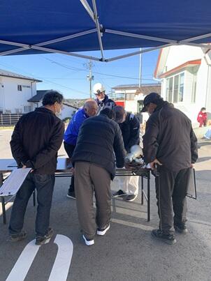 松岡タウンセンターに避難後は、名簿作成、消火訓練、防災資機材(担架・軽量リヤカー組立・発電機)稼働訓練を行いました。