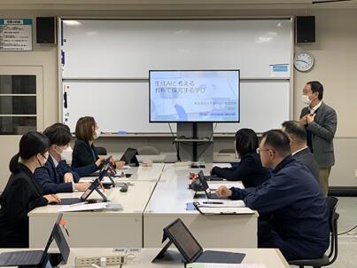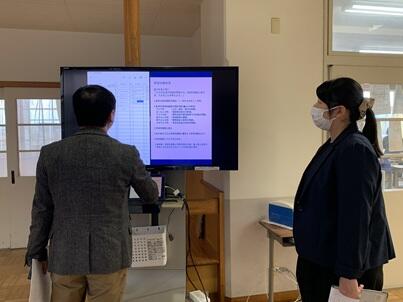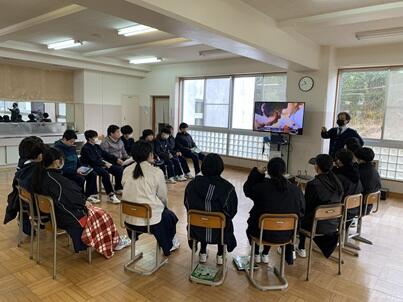 代表生徒が4名が地域連携室から津谷中学校の総合的な学習の時間(向が丘楽習)の取組や個人探究の発表を行いました。