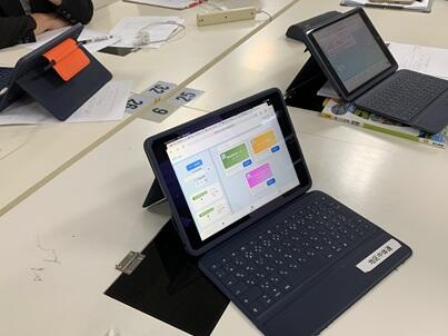 2年1組家庭 お互いの製作案をタブレットで共有しながら、話合い